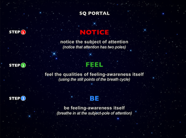 The SQ Portal is a rapid method of activating spiritual intelligence. Transit through the SQ Portal is accomplished in three steps, starting at the object-pole of attention and emerging at the subject-pole of attention. The first step starts from the state of ego within the thinking mind at the object-pole of attention. The second step dissolves the thinking mind in heart-feeling. In the third step of the SQ Portal you emerge at the subject-pole of attention, beyond the ego, as unmodified consciousness itself, otherwise known as the soul.